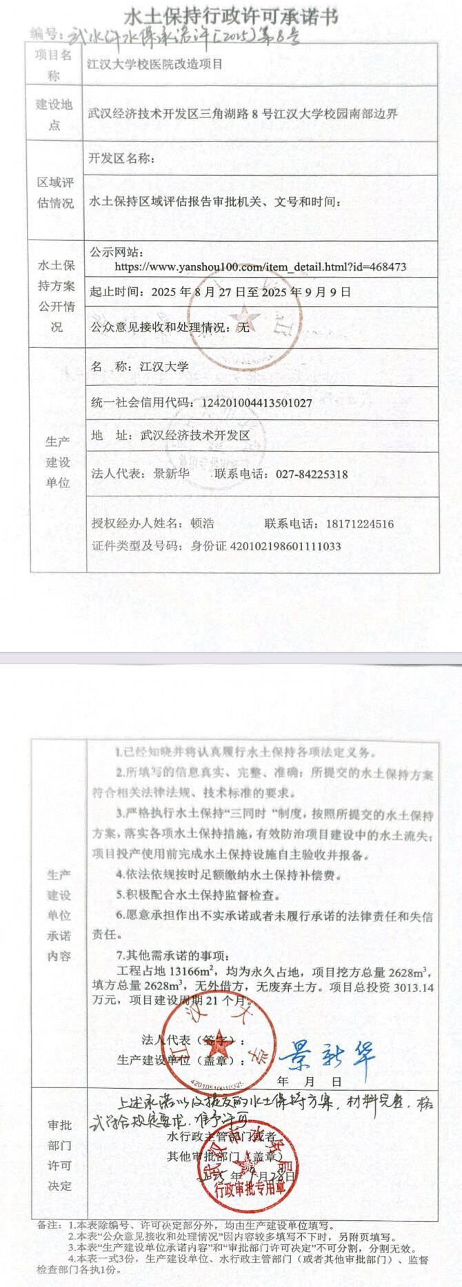 江汉大学校医院改造项目水土保持行政许可承诺书 武水许水保承诺许〔2025〕8号