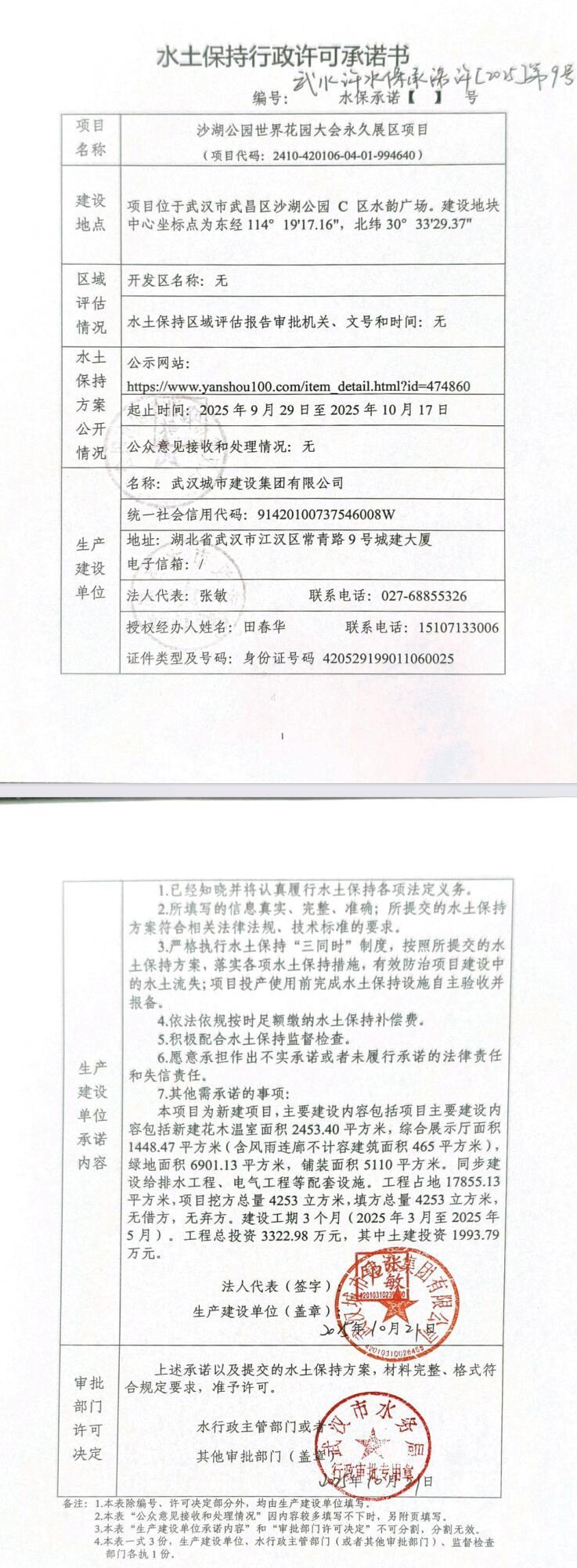 沙湖公园世界花园大会永久展区项目水土保持行政许可承诺书 武水许水保承诺许〔2025〕9号