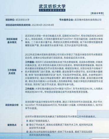 武汉纺织大学通过效益分享型合同节水管理,三年节水322.9万立方米,年节水率46.5%,荣获“湖北省节水型高校”称号;