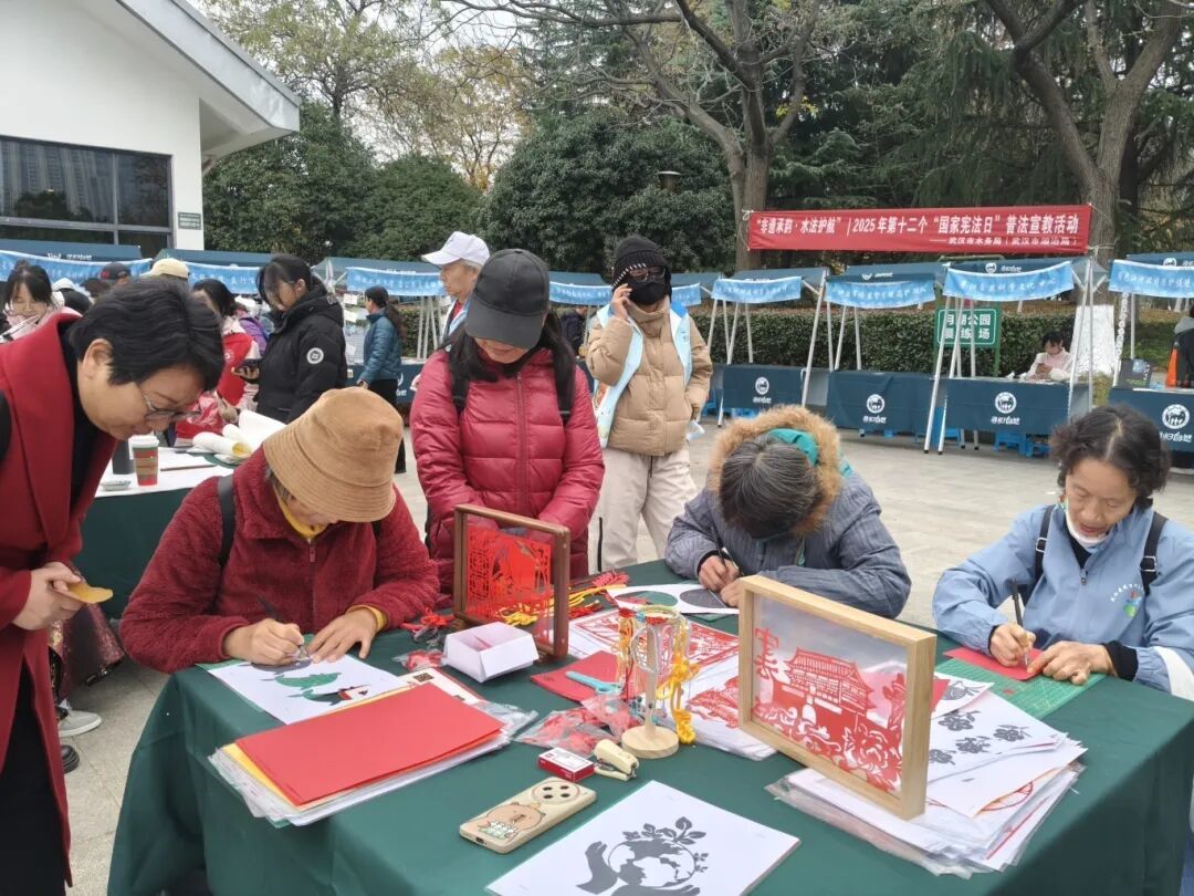 本次活动以“非遗承韵·水法护航”为主题,现场布设了剪纸、扎染、漆扇制作、书法共4个“非遗普法”体验区,鼓励市民通过非遗技艺制作具有法治宣传元素的纪念品。剪纸艺人巧手翻飞,以宪法关键词、水利标志为灵感,创作出一幅幅寓意“人水和谐”的精致作品,瞬间被市民收藏。市民张女士的感叹,“一边学手艺,一边懂法律,这个方法妙!”扎染工艺师引导市民以蓝白之色,染出水滴、江浪、湿地等图案,喻意水资源保护的清澈初心,并在体验中讲解《水污染防治法》相关条款。