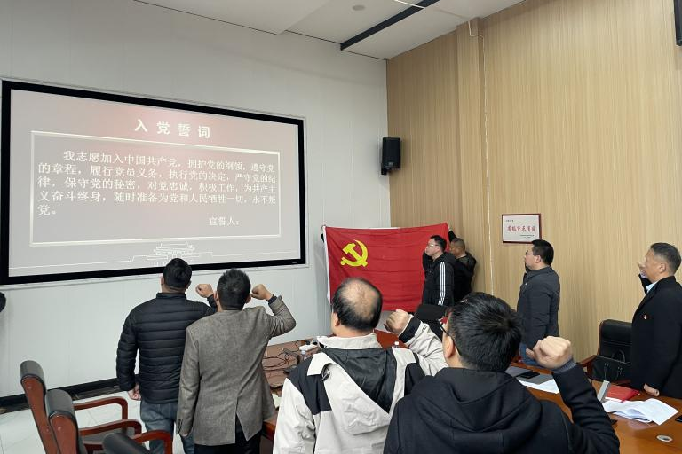 在杜家台项目部会议室,全体党员面向党旗庄严宣誓,重点学习习近平总书记近期重要讲话和重要批示精神,以及省、市奋进支点建设有关重要会议精神,并结合杜家台工程建设实践,围绕党建引领项目攻坚、业务提升与责任落实等内容交流工作思路与实践经验。