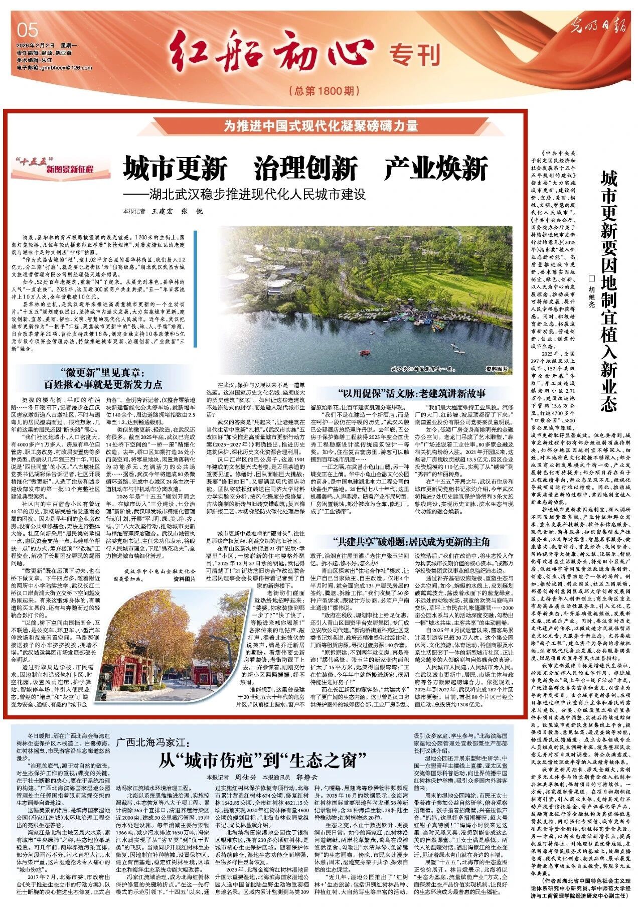 昙华林的生机,是武汉近年来推进高质量城市更新的一个生动切片。“十五五”规划建议提出,坚持城市内涵式发展,大力实施城市更新,建设创新、宜居、美丽、韧性、文明、智慧的现代化人民城市。近年来,武汉把城市更新作为“一把手”工程,聚焦城市更新中的“钱、地、人、手续”难题,出台改革清单20项、首批支持政策18条,制定金融支持10条政策和5亿元市级专项资金管理办法,持续推进城市更新、治理创新、产业焕新“三新”融合。