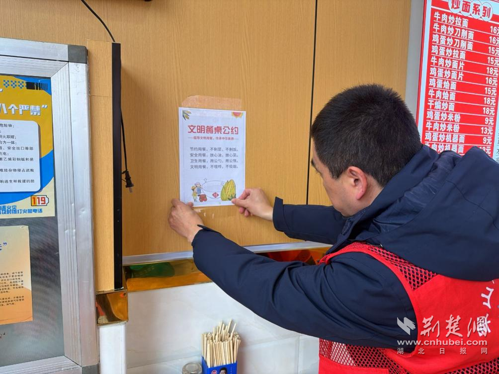工作人员在商铺显眼位置张贴《文明餐桌公约》。