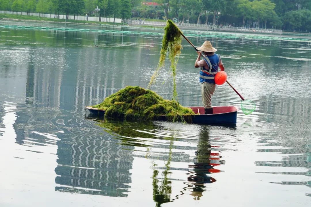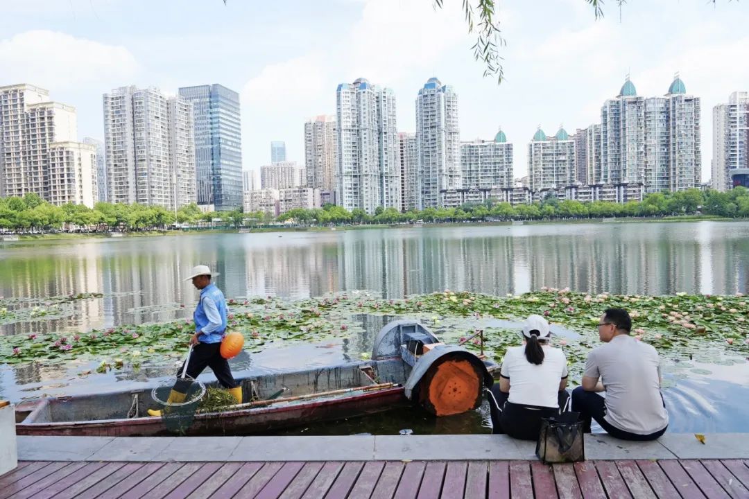 步入园中,家长带着孩子在亲水平台游玩,人水倒影相映成趣;运动爱好者挂着耳机,双臂摆动间洒下汗水。民间艺术大师们三三两两,对着乐谱弹唱;水务工作人员驾着小船,沿湖打捞。