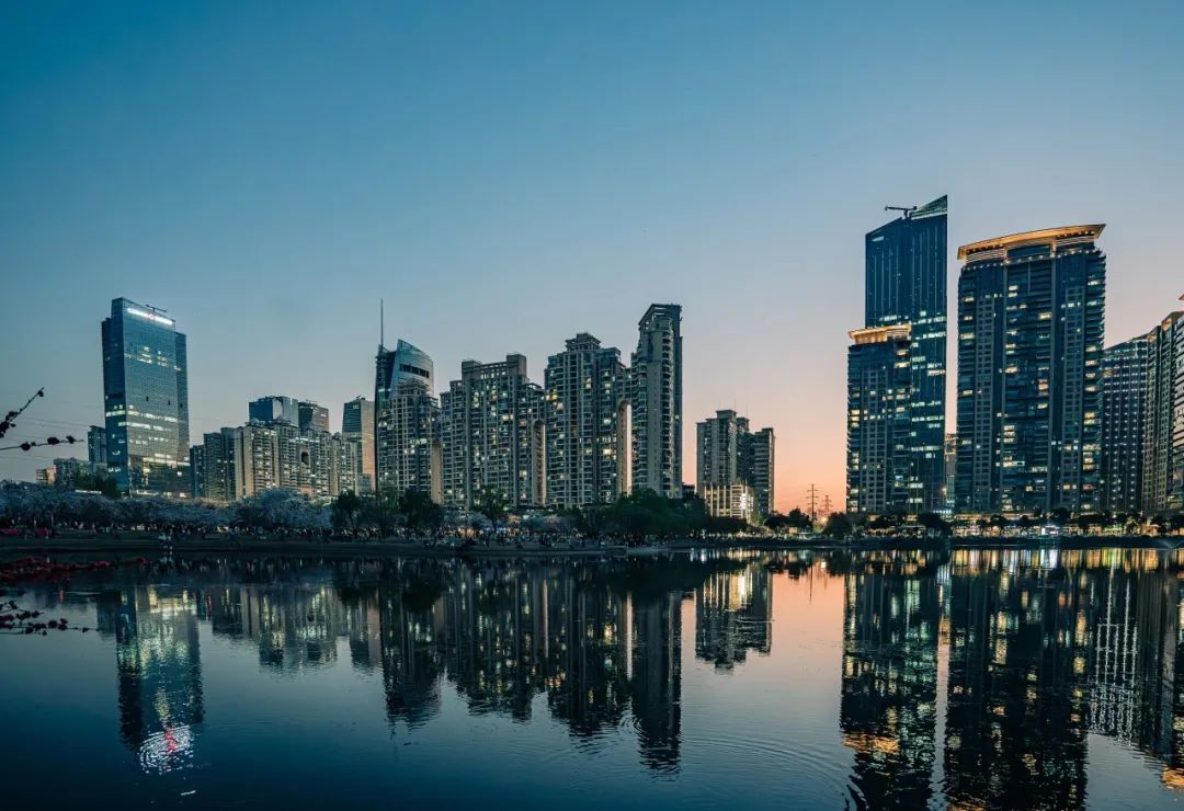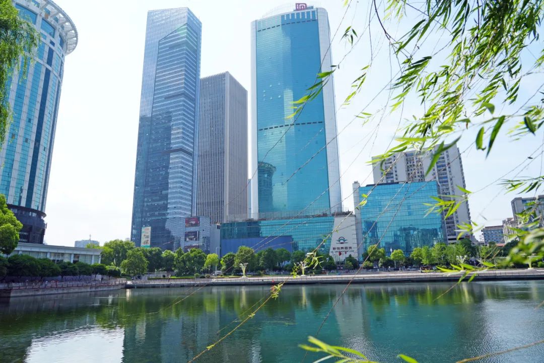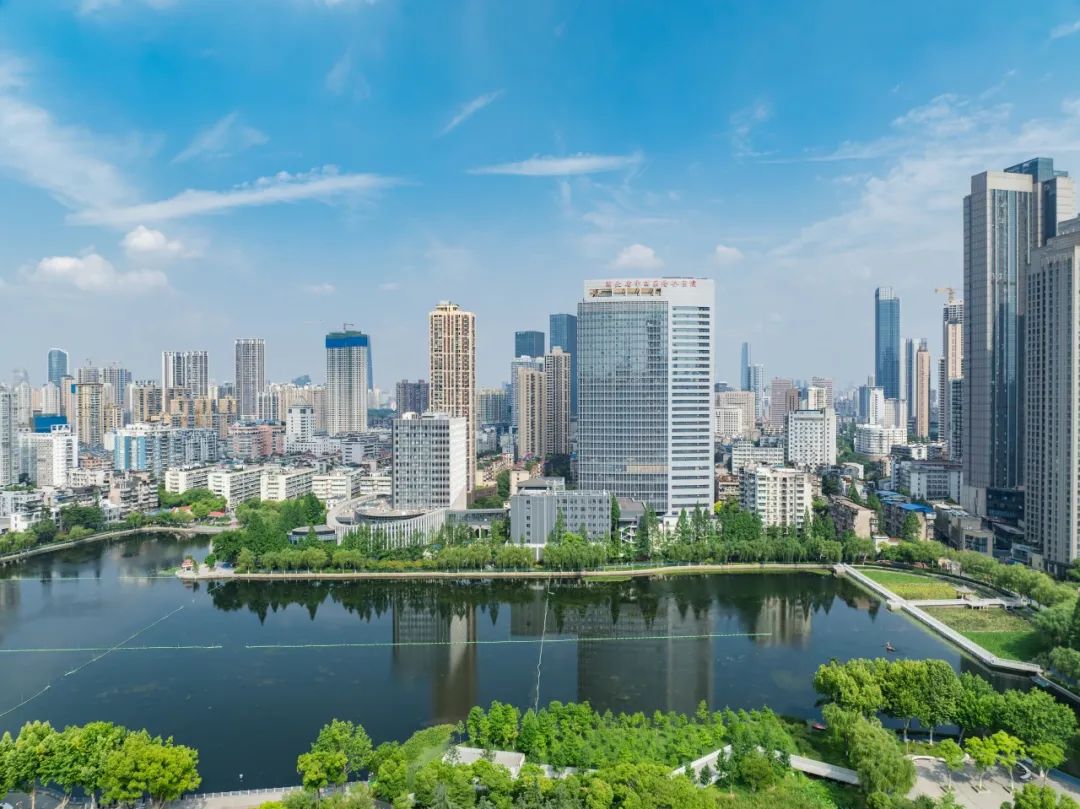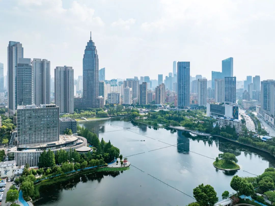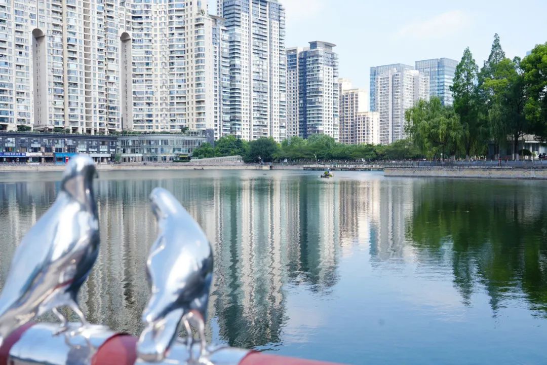 ▲西湖水域面积5公顷,湖面倒映着周边高楼的玻璃幕墙,现代感与自然美在此交融。