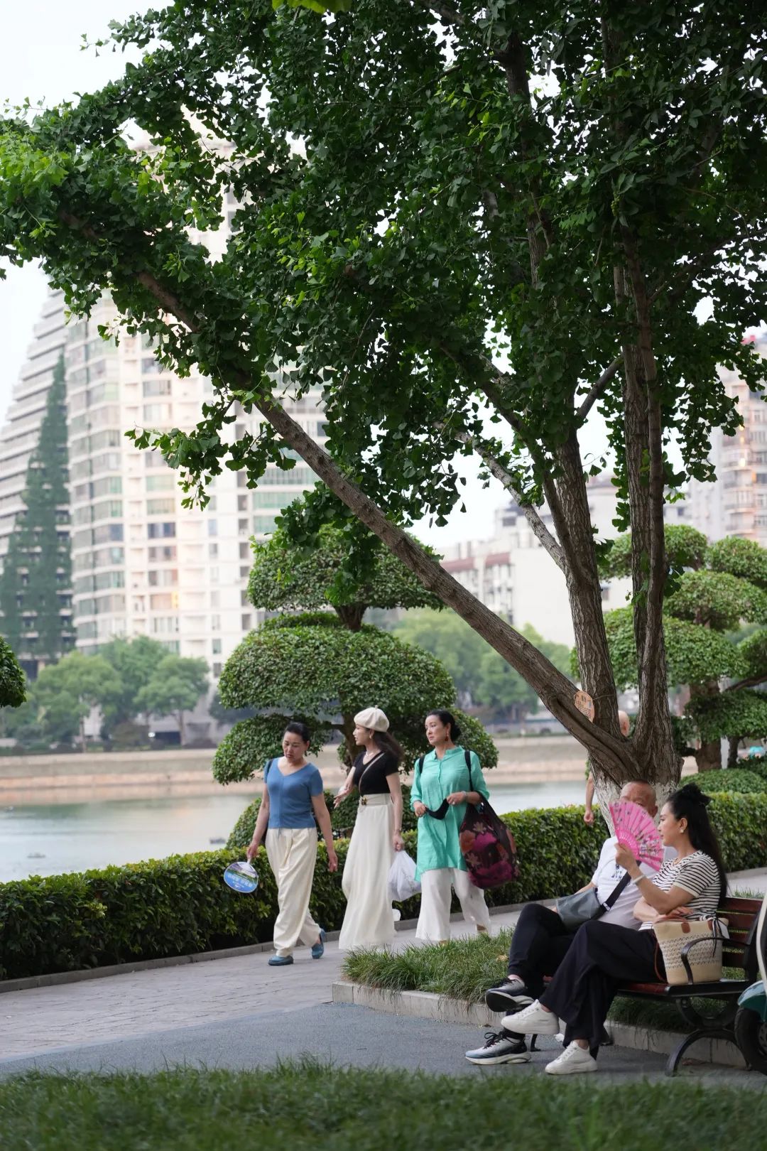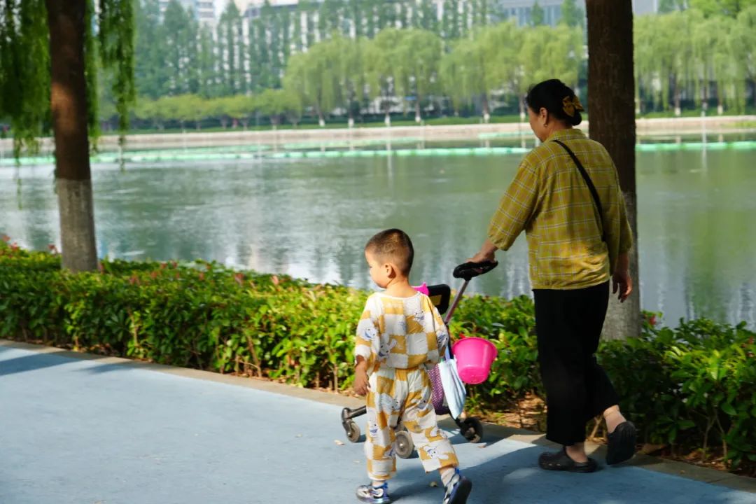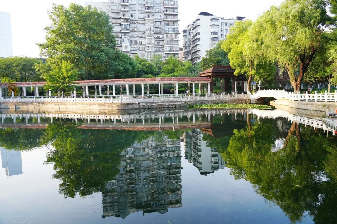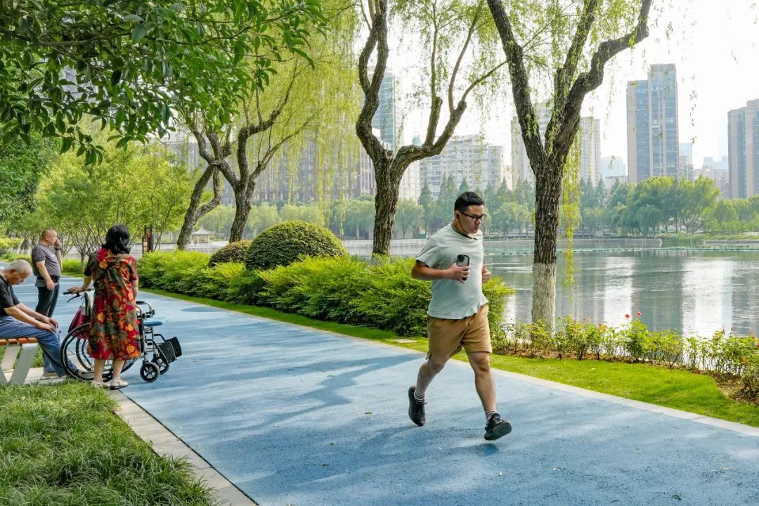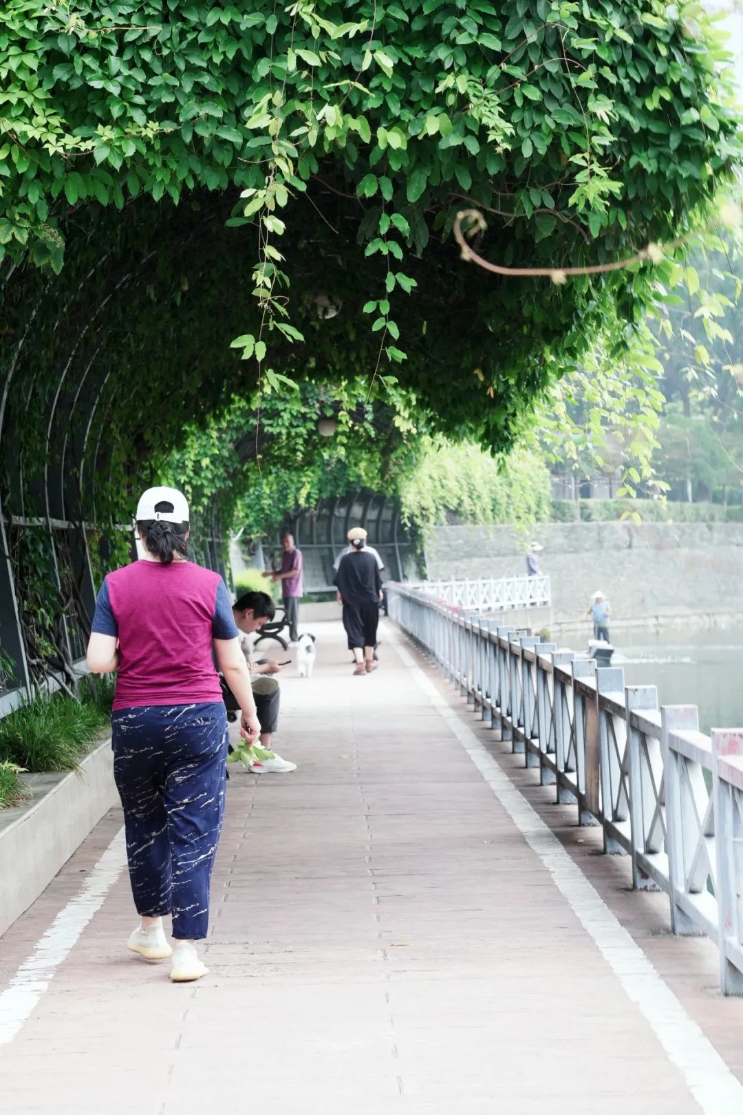 下班了的青年人或陪着放学的孩子共享亲子时光,或看鱼儿在水草间穿梭让紧绷的神经渐渐舒缓。退休的老年居民则将大把的休闲时光,用在打太极、跳广场舞、公园踱步锻炼身体上。周边绿树环抱,晚风自湖面吹来,组成一幅流动的市井水墨画。