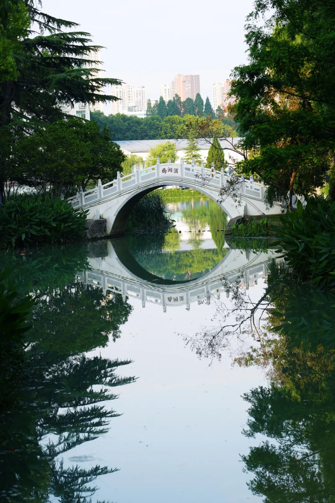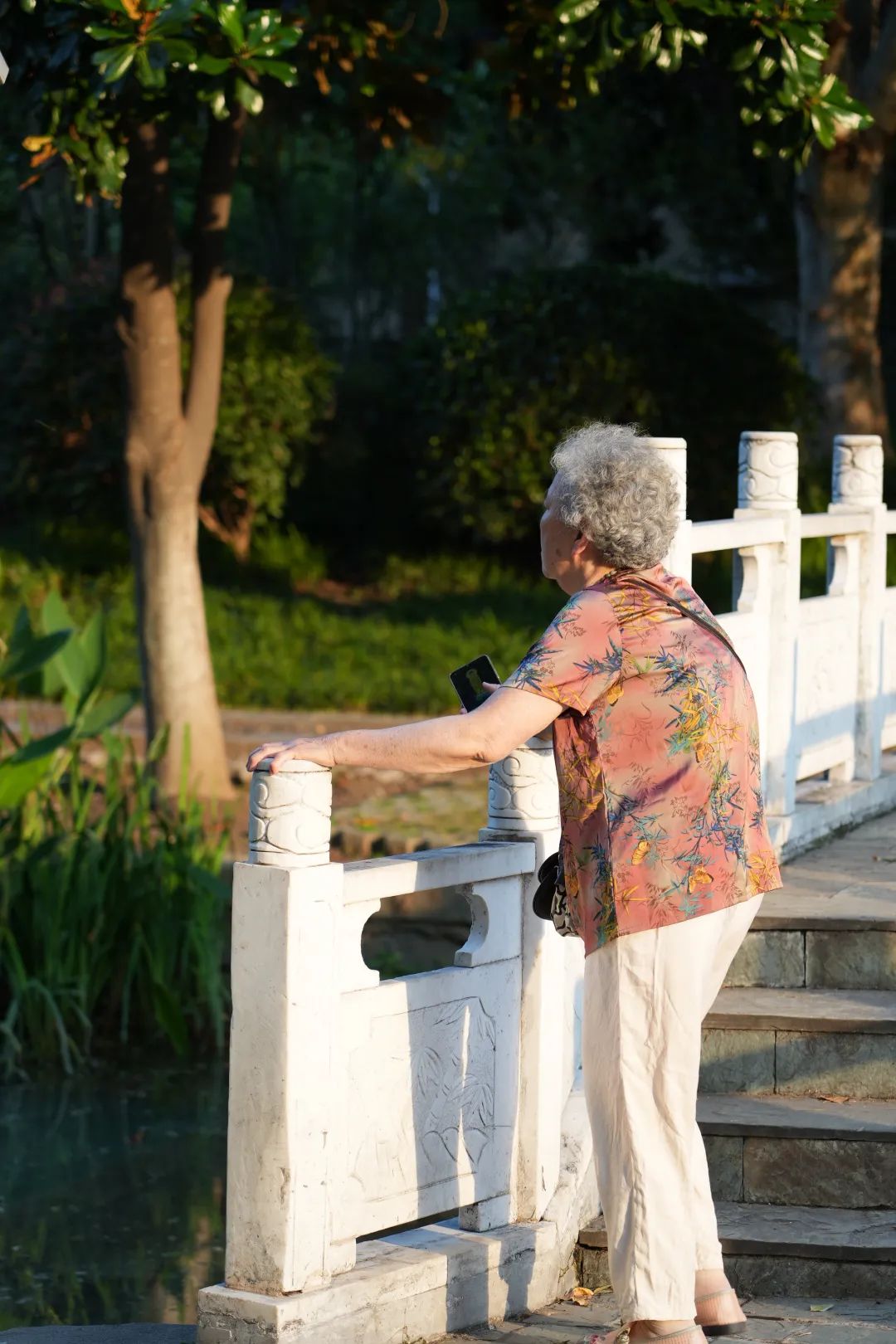 小南湖公园虽小,却五脏俱全:蜿蜒的步道旁,菖蒲与睡莲错落有致;曝气机缓缓搅动水面,泛起细碎的涟漪;两架拱桥衔接南北,游人信步融入湖景。