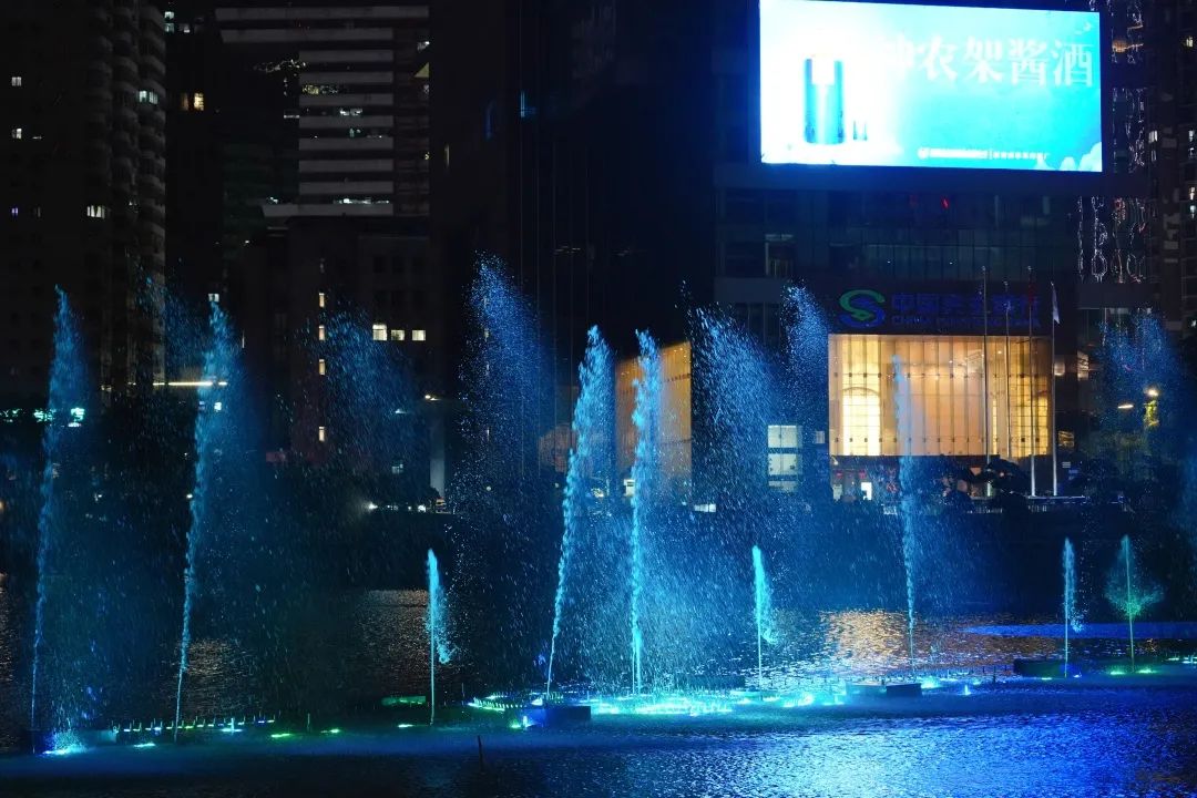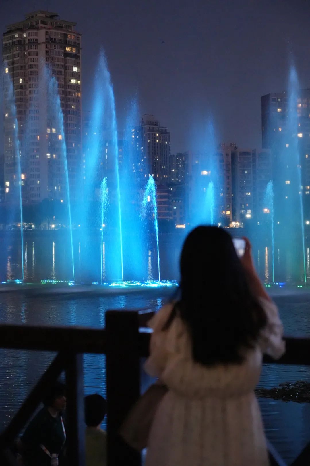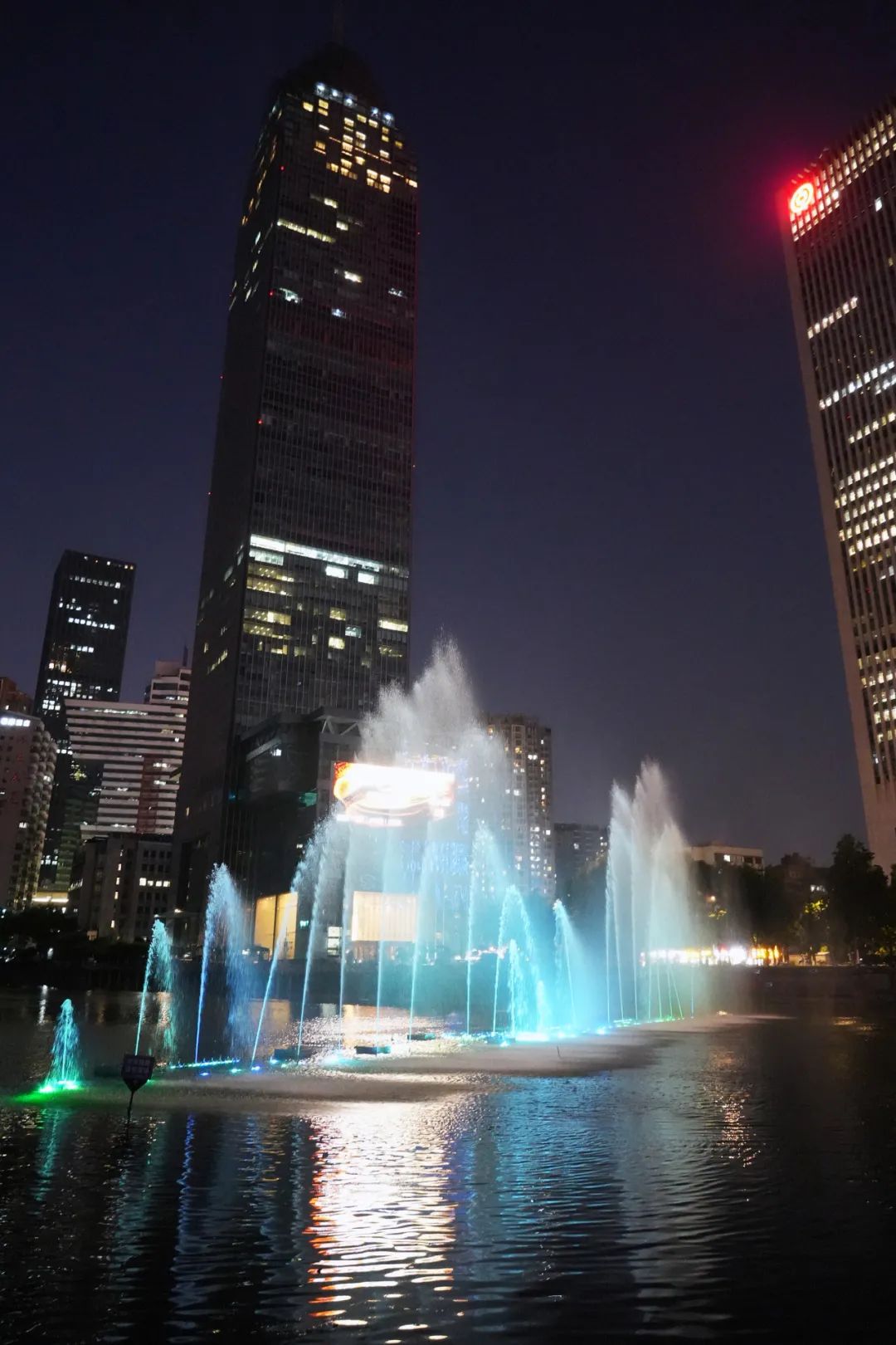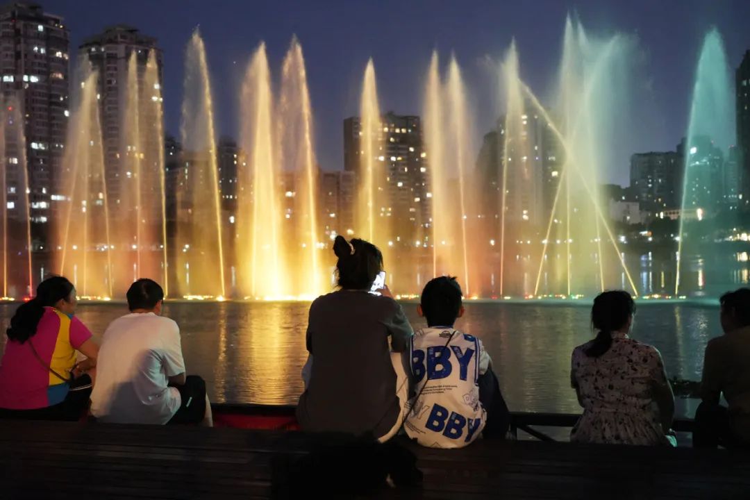 当喷泉打开,水柱随着音乐腾空而起,化作漫天清凉的雨雾,夏夜的风裹着水汽,将白天的燥热一扫而空。